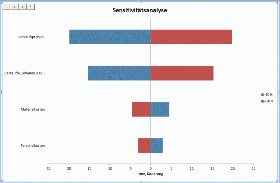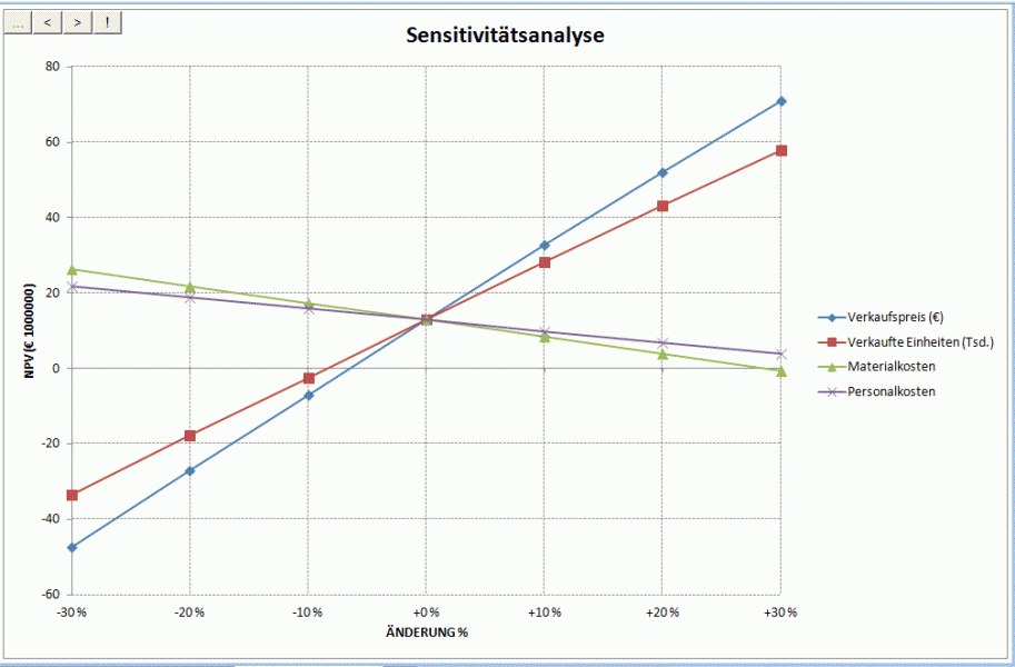 Dimensionen bzw. Variable, nach denen Analysen automatisch durchgeführt und dargestellt werden, sind: Änderung bei: Kalkulationszinsfuß, Investitionsbetrag, Erträge, Variable Kosten, Fixe Kosten, und einzelne Variable bei den Erträgen (vom Anwender zu spezifizieren). Die Höhe der Veränderungen bei den Variablen ist in der Ausgangssituation mit -20%, -10%, +10%, 20% vorgegeben und kann vom Anwender beliebig geändert werden – das Ergebnis steht dem Anwender sofort in Tabelle und Diagramm zur Verfügung.