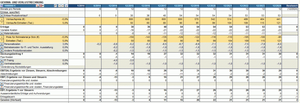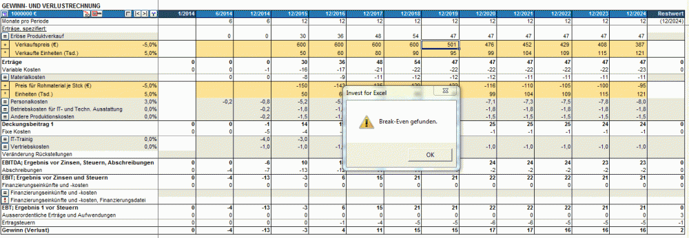 Abb.: GuV-Werte nach Ermittlung des Break even in Bezug auf die Variable „Verkaufspreis“
