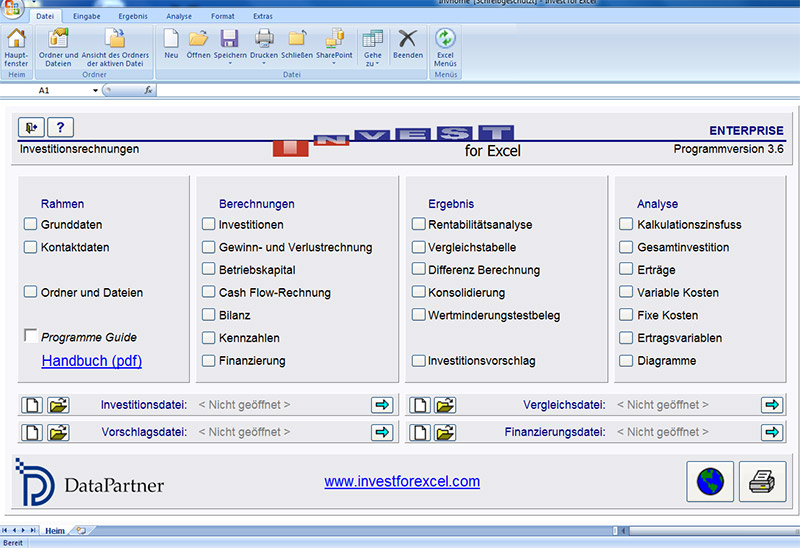 Invest for Excel®, die branchenunabhängige Softwarelösung zur Wirtschaftlichkeitsberechnung und zur Unternehmensplanung, ist seit mehr als 25 Jahren am Markt und unterstützt viele Unternehmen und Organisationen erfolgreich im Investitionsmanagement und bei der Investitionsplanung. In Invest for Excel® ist das Verfahren der Dynamischen Investitionsrechnung implementiert. Investitionsprojekte lassen sich sehr schnell und zuverlässig mit dem Tool abbilden (z.B. bis zu 256 Perioden), die Lösung lässt sich flexibel an ganz unterschiedlich strukturierte Investitionsprojekte anpassen.